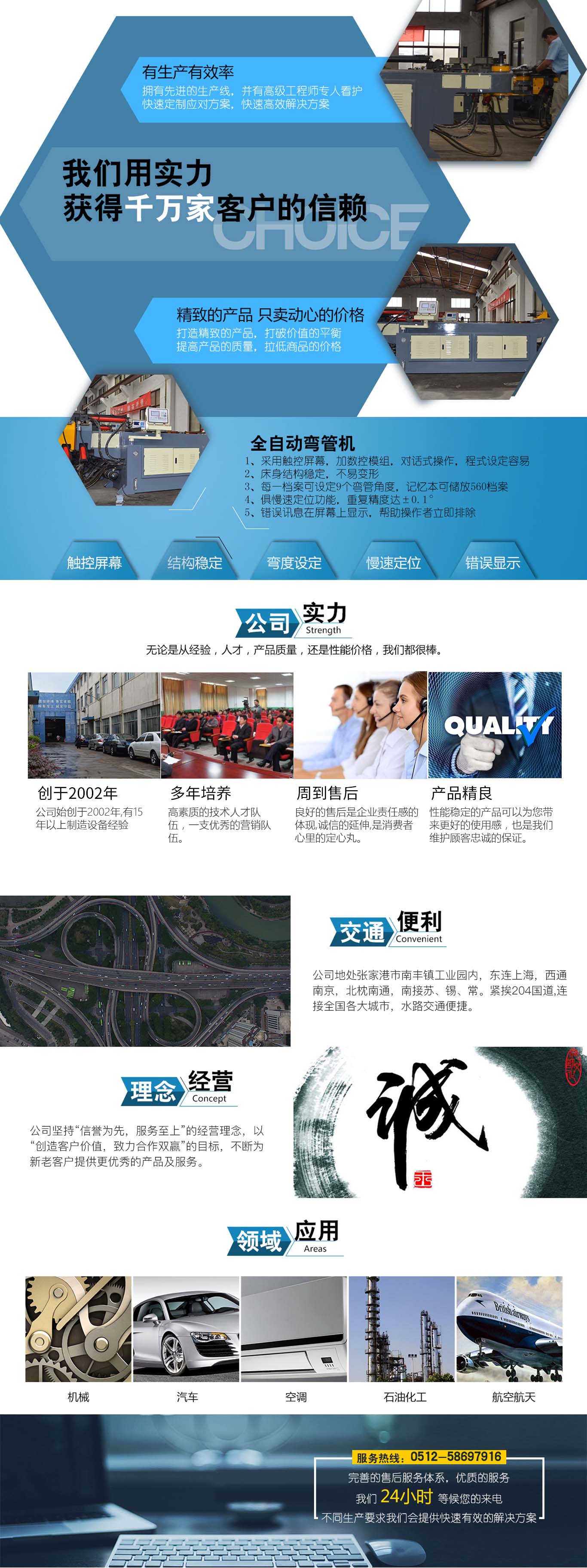 張家港市雙和機械制造有限公司始建于2001年,占地面積12000平方米,南鄰蘇州、無錫、上海,東鄰常州、南京,交通便利,位長三角中間地段,風(fēng)景優(yōu)美的張家港。 雙和公司至創(chuàng)立開始,引進(jìn)了國外的設(shè)計制造理念,組建了企業(yè)生產(chǎn)管理優(yōu)秀團(tuán)隊,致力于管材加工機械研發(fā)、設(shè)計、制造。創(chuàng)新的設(shè)計理念,嚴(yán)格的質(zhì)量把關(guān),專業(yè)的售后服務(wù),不斷提升了我在整個行業(yè)的影響力。 雙和公司生產(chǎn)的系列產(chǎn)品分為彎管機、切管機、縮管機、磨齒機、伺服彎管機、數(shù)控彎管機、液壓彎管機、自動切管機、管端成型機、倒角機、大弧滾圓機、鋁切機、壓彎機等管材加工機械,廣泛用于航天業(yè)、造船業(yè)、汽車制造、鍋爐制造、自行車、摩托車、體育健身器材、管制品家...